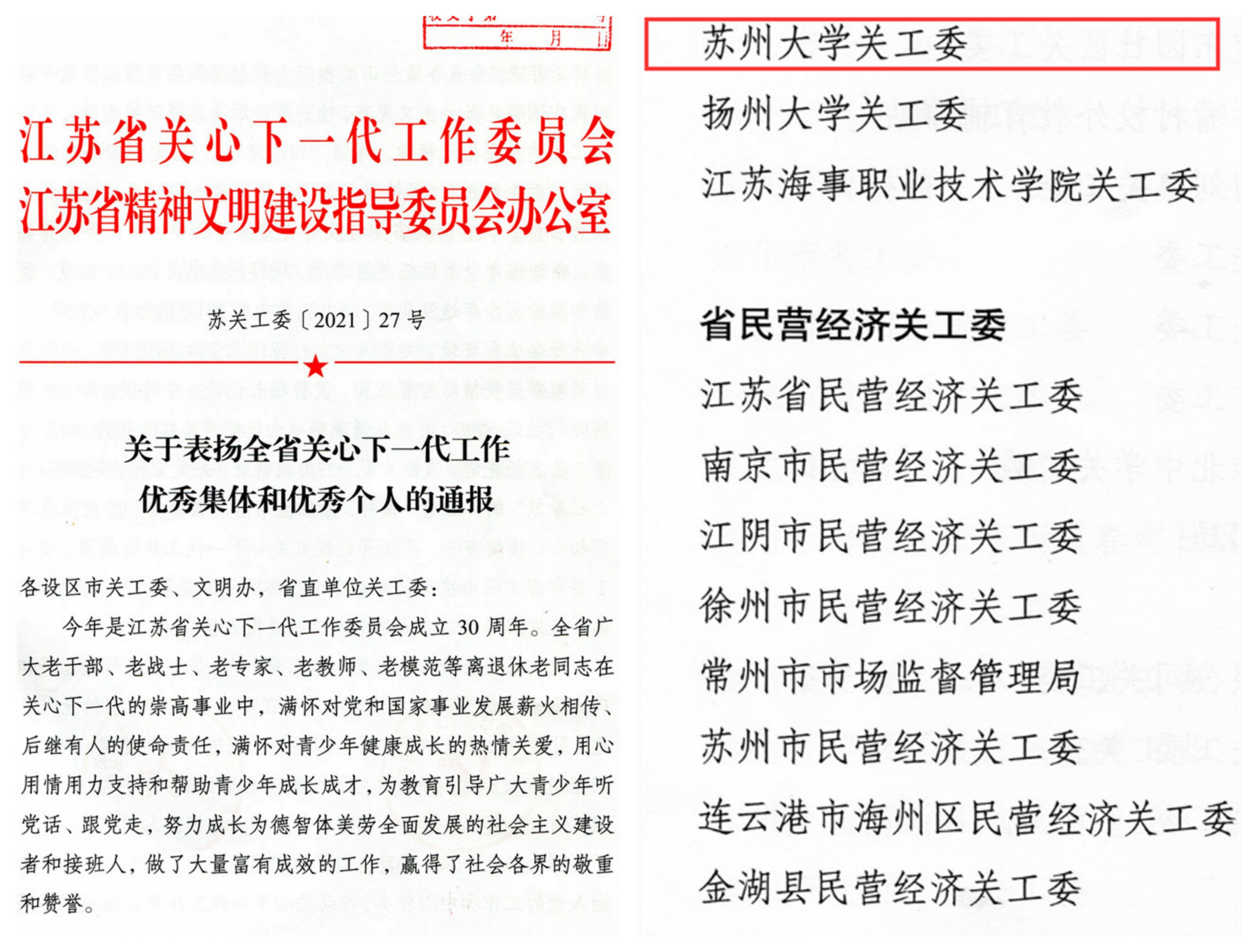 今年是江苏省关心下一代工作委员会成立30周年,为表扬先进,进一步弘扬“忠诚敬业、关爱后代、务实创新、无私奉献”的“五老”精神,激励全省各级关工委和广大“五老”不忘初心,接续奋斗,不断开创新时代省关心下一代事业新局面,省关工委、省精神文明建设办公室组织开展了全省关心下一代工作优秀集体和优秀个人评选表彰活动。经省教育系统关工委推选,我校关工委受到省关工委、省文明办表彰,荣获全省关心下一代工作优秀集体。据悉,全省仅5所高校获此殊荣。