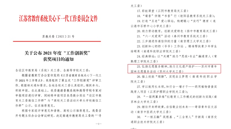 近日,江苏省教育系统关工委发布通知(苏教关委〔2021〕20号、苏教关委〔2021〕21号),公布了2021年社会主义核心价值观“精品教育项目”案例和“工作创新奖”项目获奖名单。我校关工委报送的“初心使命如何能自觉不忘”项目荣获社会主义核心价值观“精品教育项目”案例一等奖,“弘扬志愿服务精神,助力文化遗产保护——苏州市青年园林志愿服务活动”项目获得“工作创新奖”二等奖。