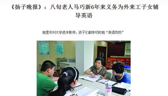 从2005年开始,马巧新老师就开始为外来务工子女辅导英语,后来,孩子们都纷纷向她请教英语问题,由于人太多,她家里待不下,于是社区人员在自己的办公用房内开辟了一个小课堂,作为她的教学用地。于是马老师一教就是多年。当被问起为什么到退休了还不好好在家享受晚年生活时,马老师回答:“我干了一辈子教师,不会这么轻易就放下,这些孩子的英语需要帮助,我就是做了我能做的事。”