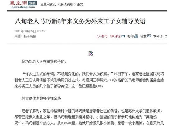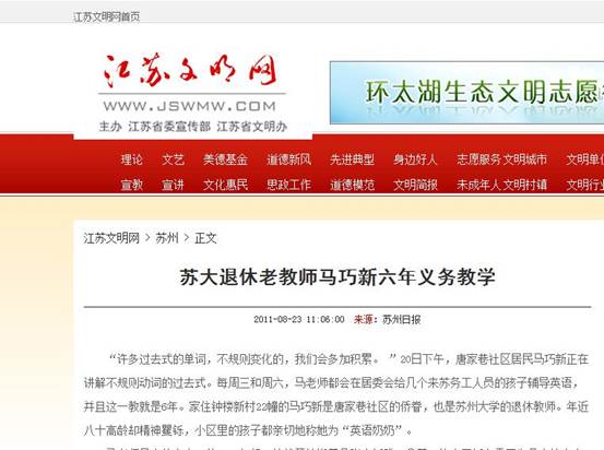 今年已经八十高龄的马巧新老师虽然已经离开苏大多年,但直到最近她才算真正退休。马巧新老师是唐家巷社区的义务侨眷,也是苏大的退休教师,但是小区里的孩子们都亲切地叫她“英语奶奶”。